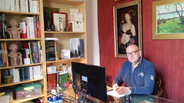 10h : réunion skype avec Gilles. Rasé de près mais en veste de survêt, Gilles pose devant une femme nue. Pas une vraie, je vous rassure, un tableau. C’est conceptuel mais on s’y fait… Il est souriant, en forme, ça me fait plaisir de voir un être humain autre que ceux qui vivent avec moi.