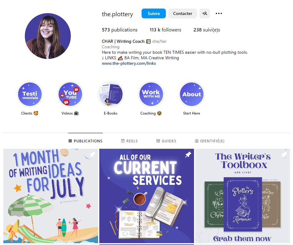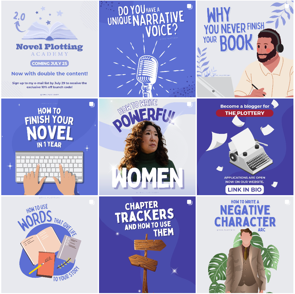 Vous ne le savez peut-être pas, mais de nombreux auteurs, chroniqueurs littéraires, conseillers en écriture utilisent Canva pour réaliser leurs publications ! C’est notamment le cas de @the.plottery, une coach en écriture suivie par près de 113 000 followers.